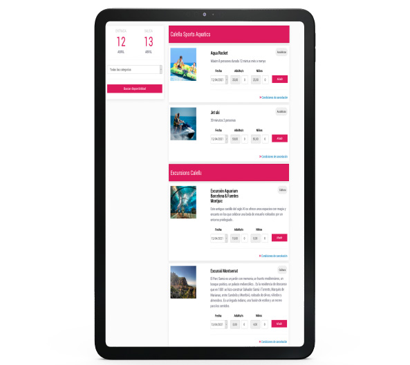 Con este módulo se pueden vender todo tipo de servicios y/o actividades adicionales. Se puede dar acceso directo a estos mismos proveedores para la gestión directa de la carga de datos y para la actualización de inventario y precios. El usuario final podrá añadir de manera sencilla los diferentes servicios y/o actividades mediante el proceso de compra, confirmar el resumen de su reserva y proceder a un pago único. Y todo, en un procedimiento 100% online.